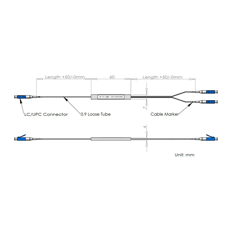 1 × 2 pachet de tuburi de oțel Splitter PLC 60x7x4mm, cu 900 μm lungime a tubului liber 1,0m, conector LC/UPC.Specificații de performanță:ParametriSimbolSpecificațiiUnitateNumărul canaluluiCH1 × 2Lungimea de undă de funcționare1260 ~ 1650nmLungimea de undă de testare1310/1550nmRaport spect......